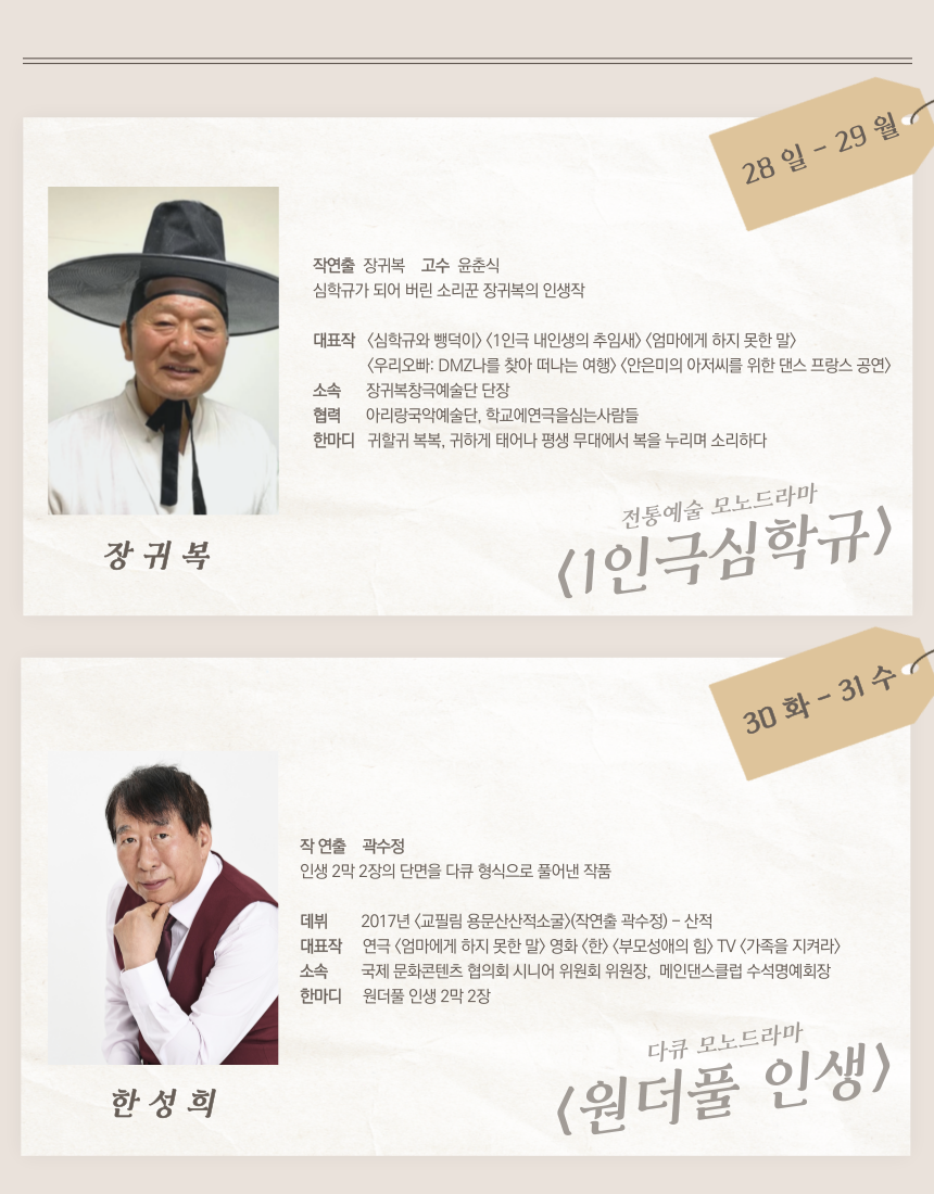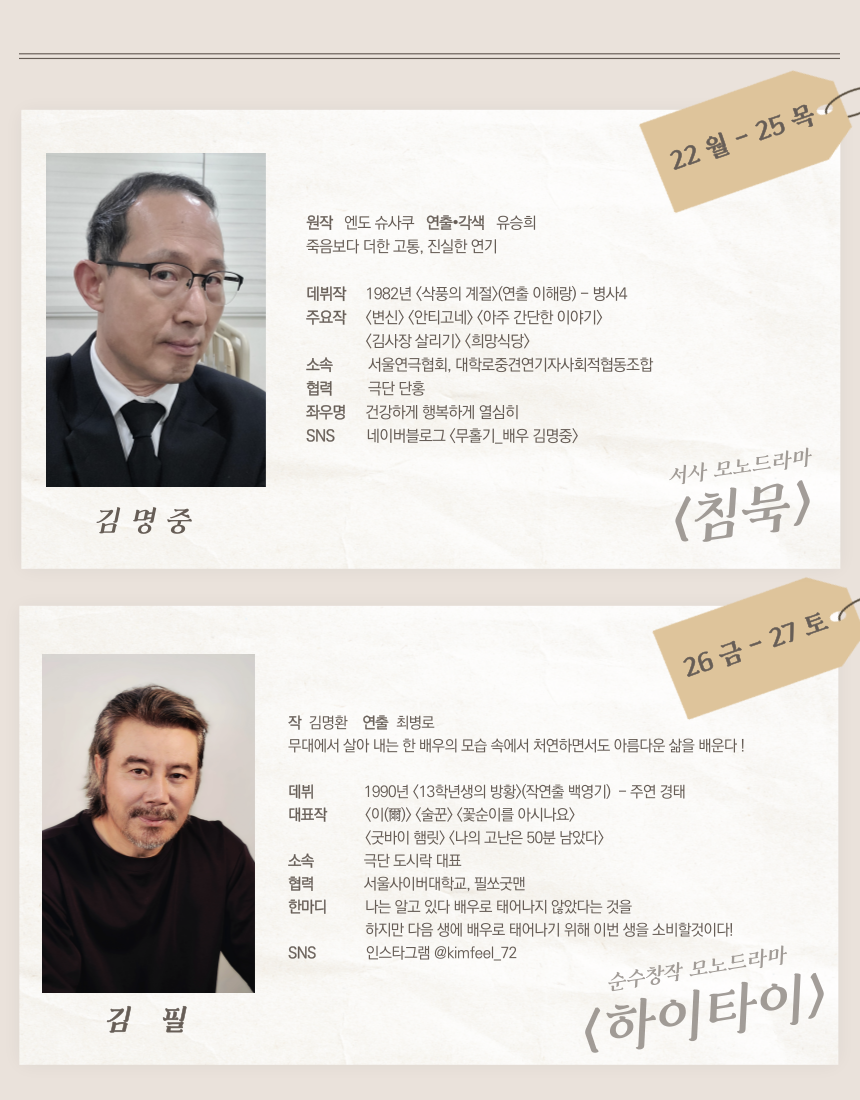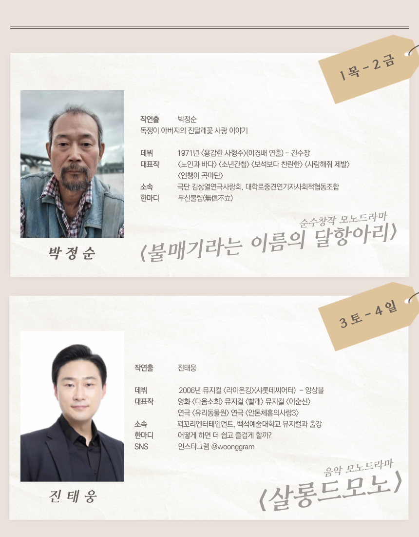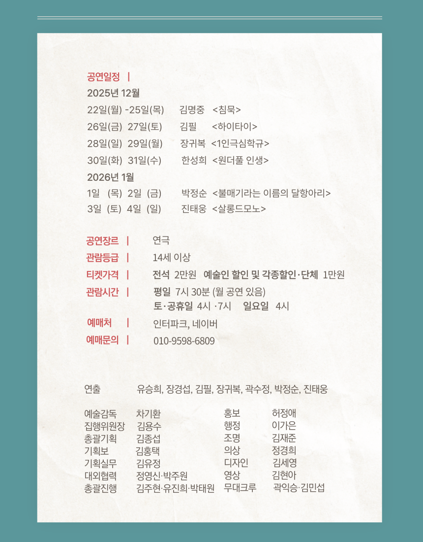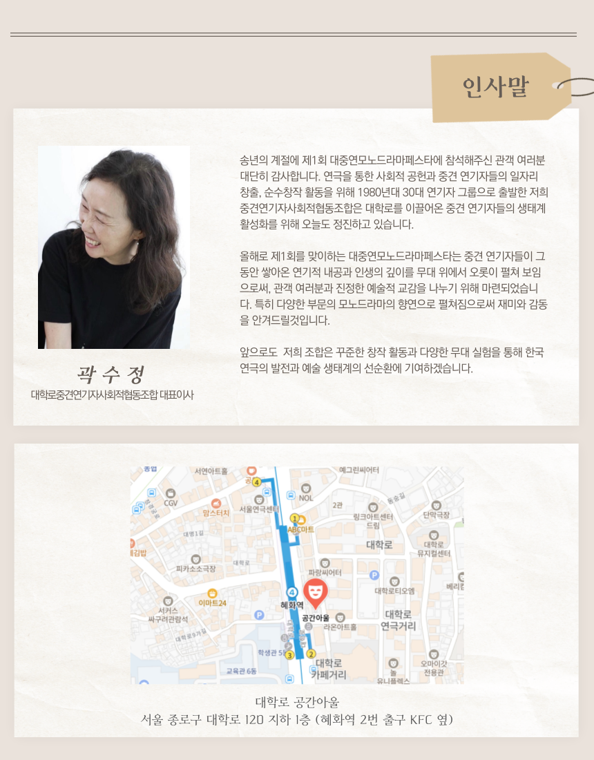 ※ 예매처 오픈시 서울연극협회 회원 할인 권종을 추가해주시면 약5000명의 서협회원(정회원+관극회원)에게 공연 정보를 메일로 전달하는 서협 메일링 서비스를 1회 무료로 진행해 드립니다.