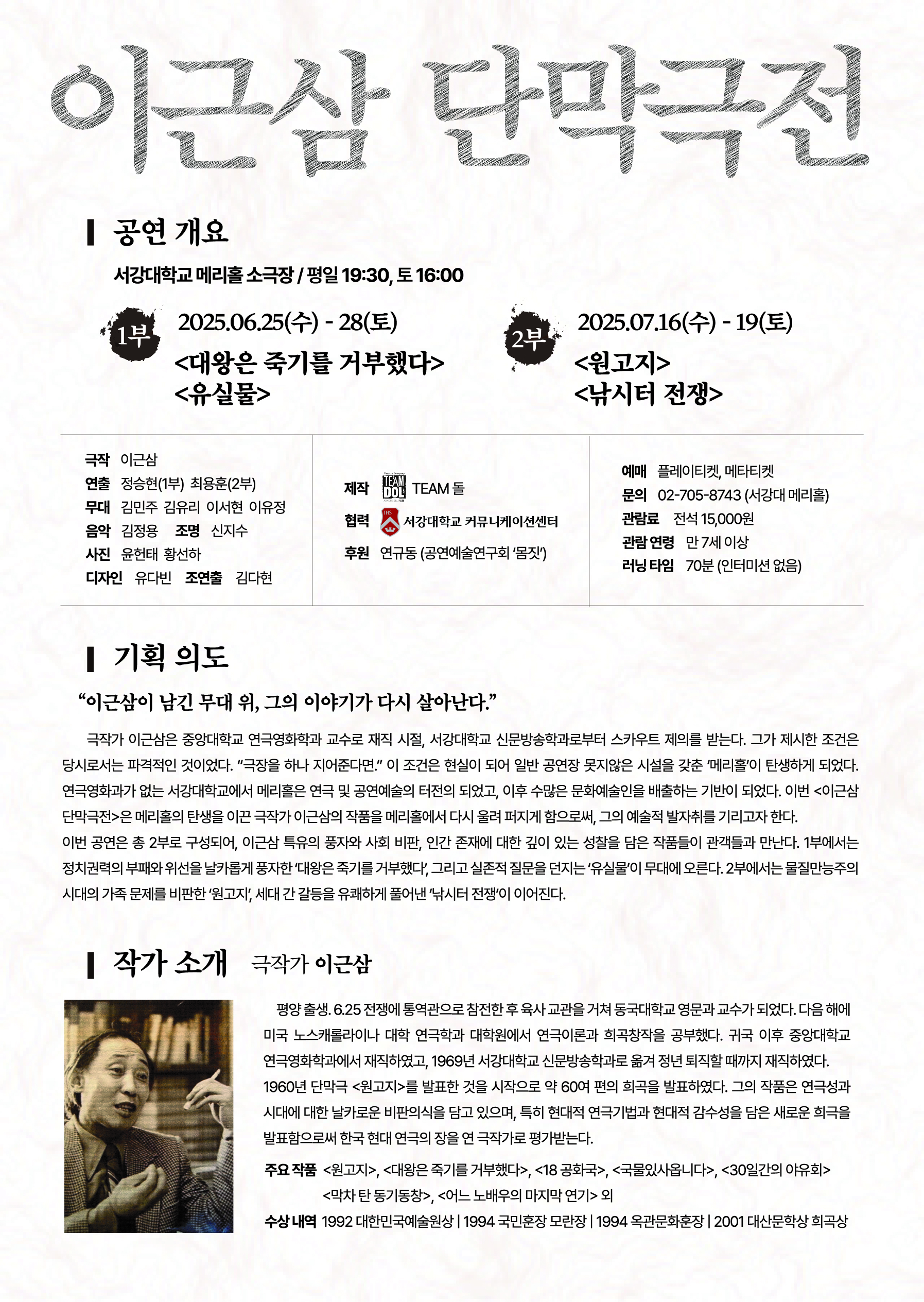 ※ 예매처 오픈시 서울연극협회 회원 할인 권종을 추가해주시면 약5000명의 서협회원(정회원+관극회원)에게 공연 정보를 메일로 전달하는 서협 메일링 서비스를 1회 무료로 진행해 드립니다.